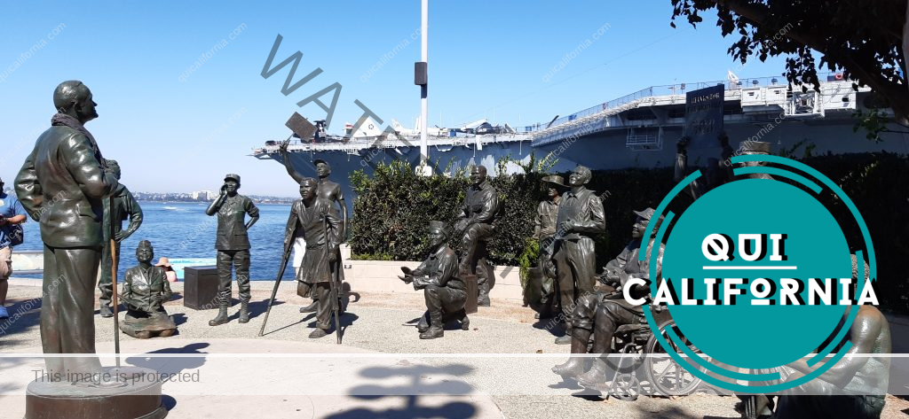 Camminiamo ora verso il mare fino a raggiungere lo scenico Fish Market Restaurant: ci troviamo in mezzo a un gruppo di 16 statue in bronzo in divisa militare su una piattaforma circolare che dà proprio sul mare, con sullo sfondo, la gigantesca USS Midway (portaerei, di cui vi parlo tra poco). Questo monumento è il National Salute to Bob Hope and the Military.